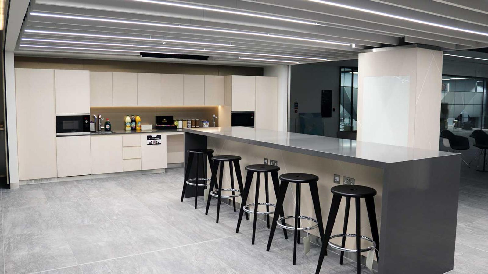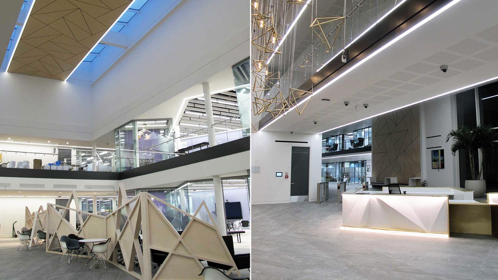 Delivery of bespoke joinery throughout the atrium and three workspace floors, covering tea points, breakout zones, recycling stations, seating, collaboration booths and a signature reception feature, plus joinery for meeting and shared areas.