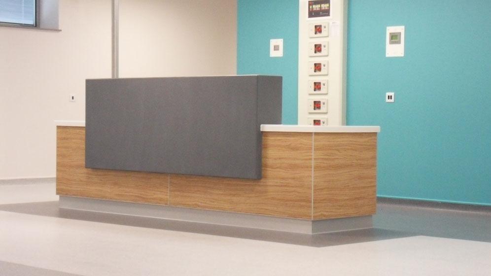 Specialist healthcare joinery including nursing stations, feature reception desks, bespoke paediatric carer beds, infection-control joinery systems and a public café fit-out.